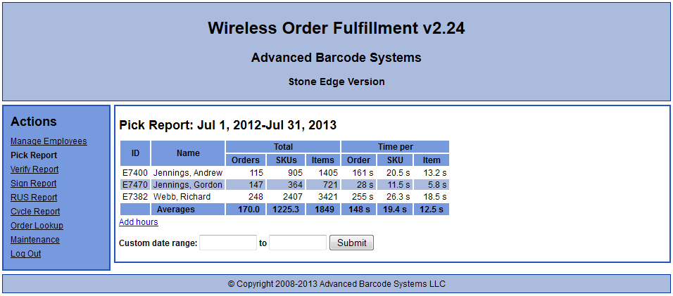 A report showing employee picking productivity: (Similar reports exist for the verify and sign processes.)